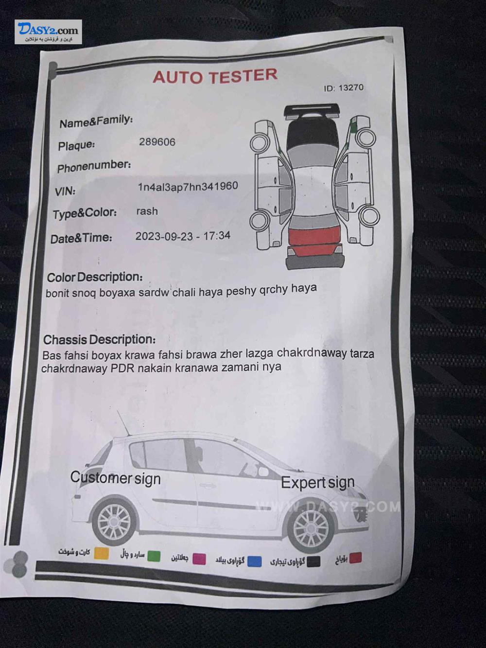 سەیارەکە نمونەیە لە جوانی، مەکینەو گێڕ بە شەرت و زۆر پاک ماوەتەوە ، دوو پارچەی بۆیاخە بۆنیت و سنوق , چەمەلەغی لای سەکن سێ پەنجە قوپاوی هەیە زۆر کەمە، بۆیاخی بۆنیت ی تۆزێ کاڵ بۆتەوە. ئێرباگی سوکان تەقیەوە و سیستەم کراوە.