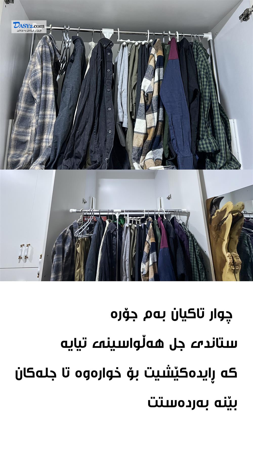 دوو تاکی لای ڕاست سەرەوە و ناوەڕاست سەروو چەکمەجەکان بۆ جلوبەرگە ،لەگەڵ ستاندی جلوبەرگ بەو شێوەیەی دامناوە بۆ هەڵواسینی جل ئەتوانرێت داببەزێنرێت و بەرز بکرێتەوە