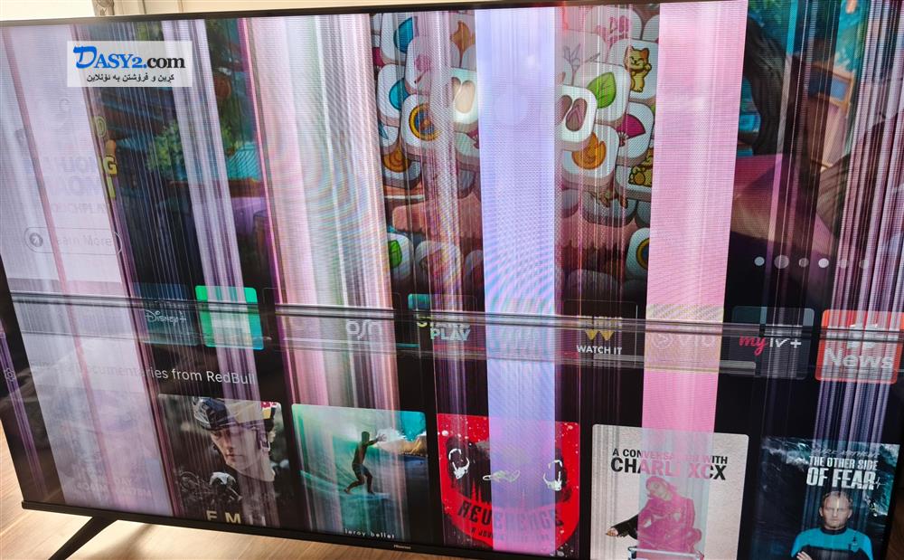 تێلیڤیزۆنی ٦٥ ئینچی 4K سمارت لە مارکەی Hisense، پەنێڵی شکاوە.