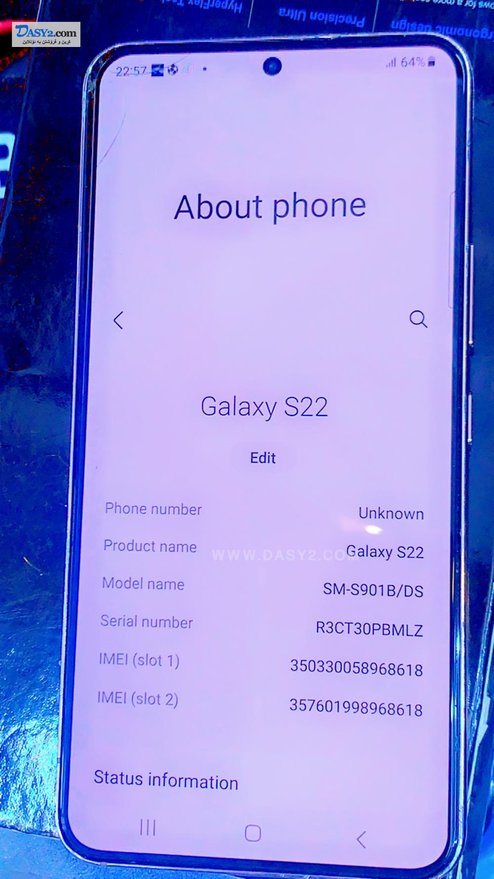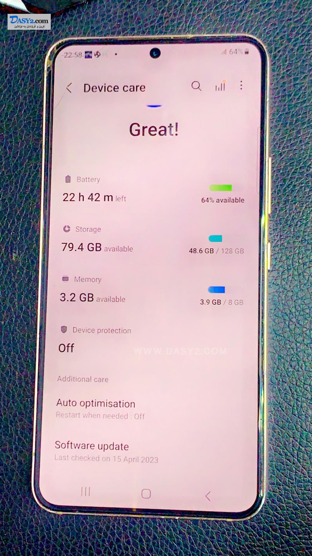 Samsung s22 وه ك نوى وايه ئه ورپييه رامى٤ گيگا. زاكيره ى ١٢٨ گيگا تنها له سوچيكى درزيكى بچوكى تيايه